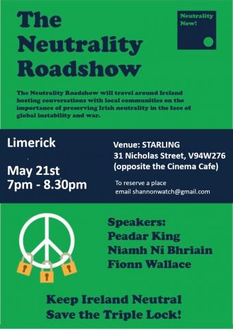 The Limerick event is organised by Shannonwatch and will take place at 7pm in STARLING, 31 Nicholas Street, V94W276 (opposite the Cinema Cafe).