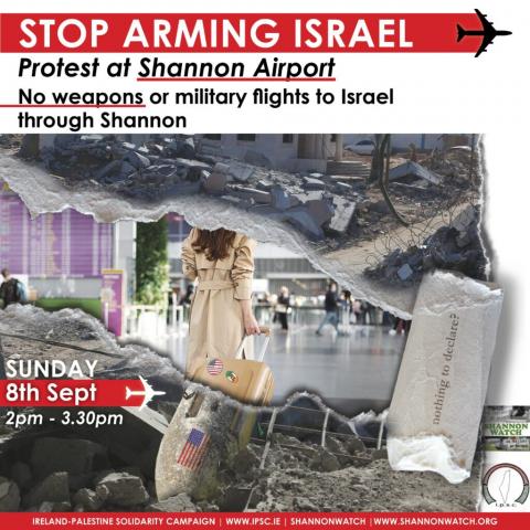 Join Shannonwatch and the Ireland-Palestine Solidarity Campaign for a National Mobilisation at Shannon Airport on Sunday 8th September, between 2pm and 3.30pm, to say ‘Stop Arming Israel – No weapons or military flights to Israel through Shannon!’