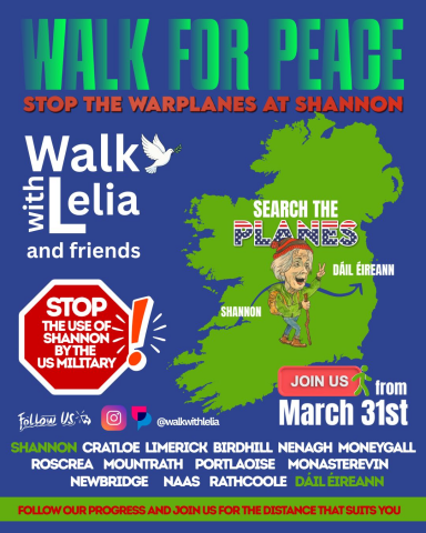This is a walk for peace, for closing Shannon airport to US military planes and personnel, to passing the Occupied Territories Bill, and to protecting our national neutrality from war mongers.